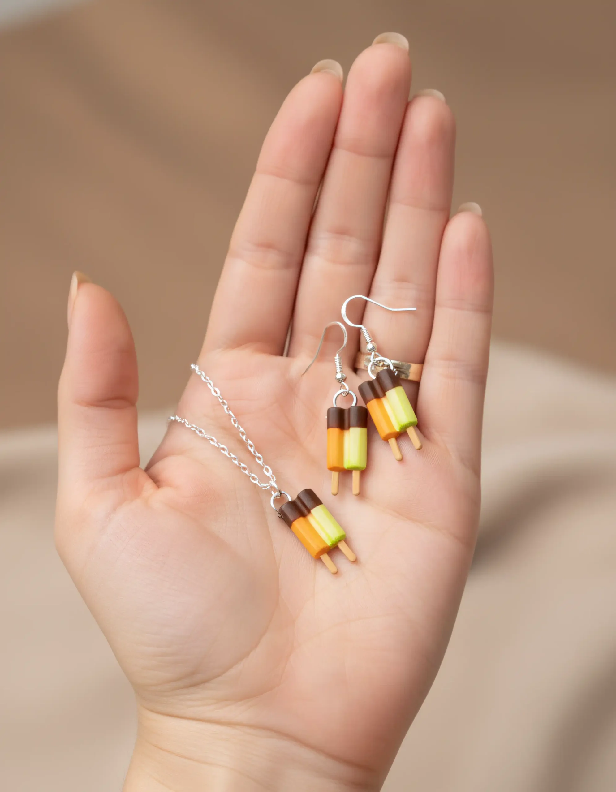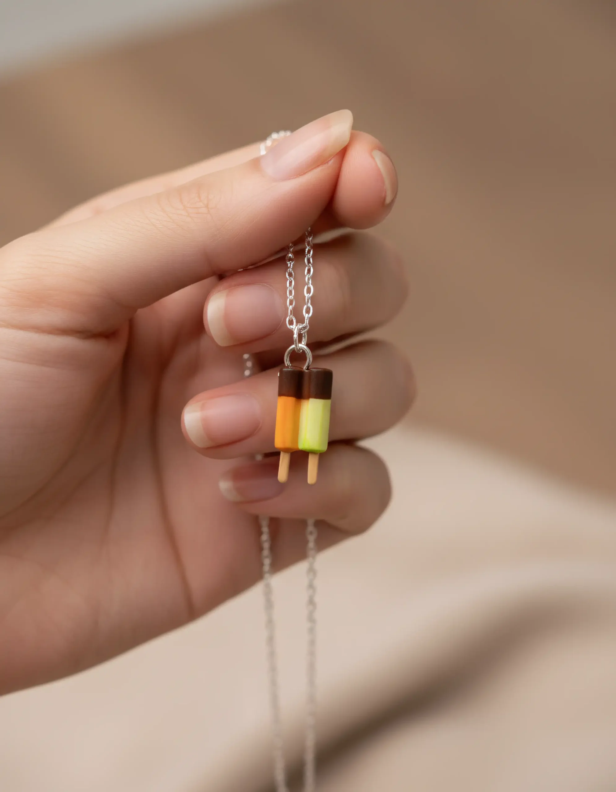 Das beliebteste Eis am Stiel – jetzt als tragbares Mini-Kunstwerk! Unser „Twinni Eis“-Schmuckset besteht aus einer Halskette und passenden Ohrringen mit je einem ca. 15 mm großen Anhänger, der detailverliebt von Hand bemalt wurde.